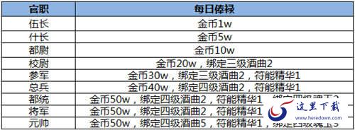 不同的官阶获得相应永久属性加成,分别包括攻击、防御、生命值、韧性和暴击等。想要属性加成高,那么你的官阶也要越高,还可以根据自身的官阶,每日领取相应的俸禄,包括了大量金币、酒曲、符能精华等,具体的俸禄如下表: