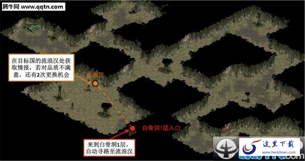 “刺探军情”为征途玩家所熟知的三大日常活动之一,玩家需要在本国边境NPC“兵马大元帅”处选择刺探目标国家,接受刺探任务,然后自动寻路到目标国家的白骨洞1层“流浪汉”处获取情报(若对获取的情报品质不满意,还有2次机会可以更换情报品质)。最后将获取的情报交还给本国边境NPC“兵马大元帅”,得到经验奖励。