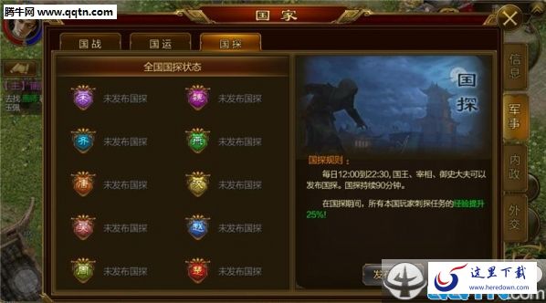 有权限的官员发布国探有两种途径:(1)通过“国家”界面打开“国探界面”发布;(2)通过与NPC兵马大元帅的对话框界面打开“国探界面”发布。