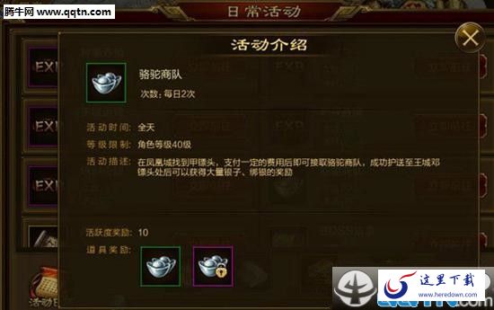 这个任务就是为了赚银子而生的,在这个任务中玩家可以获取绑银和通用银两,这个任务开启的等级是40级,玩家等级达到之后就可以在凤凰城找到镖师接取,不过这个任务接取是要费用的,玩家接取之后把镖车安全的送到王城邓镖头那就行了,这个任务的难度还是有的,所以玩家在接取的时候一定要注意了。
