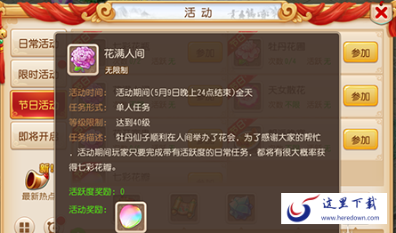 牡丹仙子顺利在人间举办了花会,为了感谢大家的帮忙,活动期间玩家只要完成带有活跃度的日常任务,都将有很大概率获得七彩花瓣,赶快去完成日常任务吧。