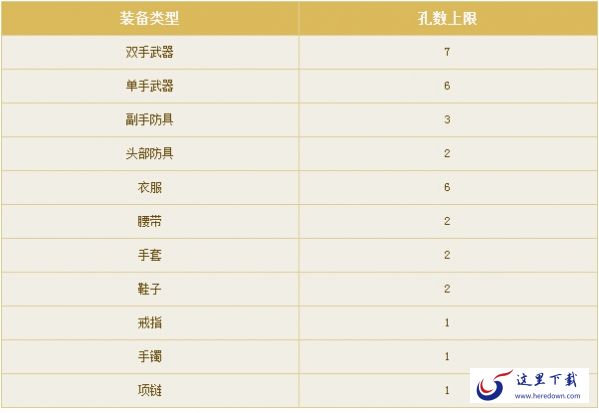 装备可能会随机出现孔,每一个孔都可以镶嵌一颗宝石,但同一件装备上不能镶嵌两颗同种宝石。装备上的孔的数量不确定,但每一类装备上孔的数量都会有上限。