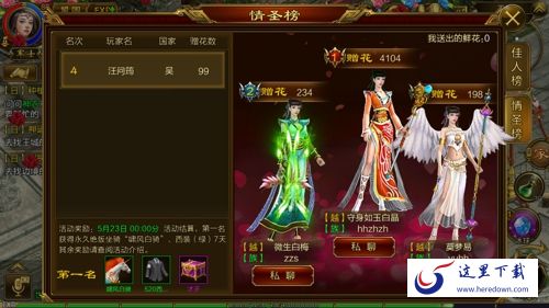累积送花冲击情圣榜(男女皆可),全服排名以下名次可获得: