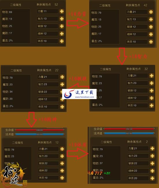 (2)分配属性点所获得的攻、防以及血量并不会纳入装备属性的百分比运算,装备属性里面的百分比加成只作用于装备本体。