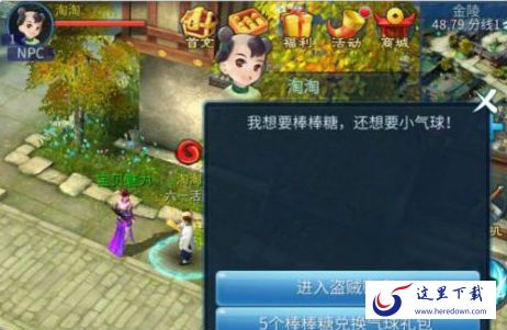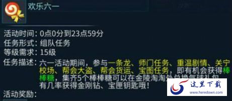 活动期间参与日常活动有几率获得棒棒糖奖励,收集5个棒棒糖可在金陵NPC淘淘处兑换气球礼包,有几率开出金刚钻、宝匣钥匙等珍贵礼物。