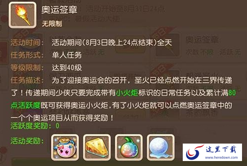 奥运会才召开,梦幻西游手游中的圣火也已经点燃,开始在三界传递了。期间,只要少侠们完成日常任务中带有小火炬标识的任务,并且累计满80点活跃度,就可以获得奥运小火炬。小火炬可以用来点燃奥运签章中的奥运项目,并获得对应的奖励。