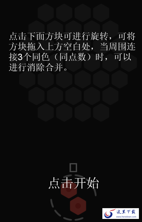 下载六角拼拼游戏客户端后,打开就可以看到提示,点击屏幕下面的方块可进行旋转,可将方块拖入上方空白处,当周围连接3个同色(同点数)时,可以进行消除合并。核心玩法中的每个元素虽然看起来都平淡无奇,但组合在一起就有1+1>2的效果,十分奇妙。具体步骤如下:
