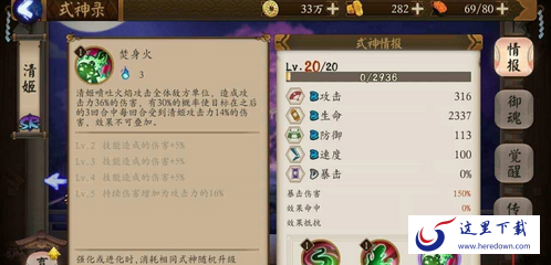 清姬喷吐火焰攻击全体敌方单位,造成攻击力36%的持续伤害,有30%的概率使目标在之后的3回合中每回合受到清姬攻击力14%的伤害,效果不可叠加。