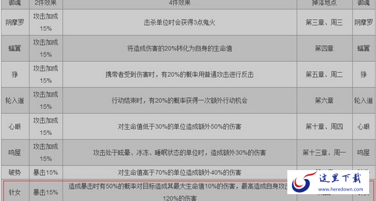 4件效果:造成暴击时有50%的概率对目标造成其最大生命值10%的伤害,最高造成自身攻击120%的伤害。