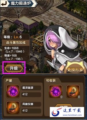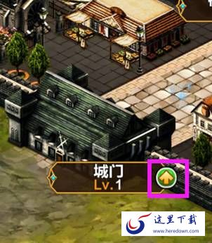 升级城镇中的建筑需要消耗不同的材料,当该建筑可升级时,会显示出如下图中的箭头,点击就可以对建筑进行升级。