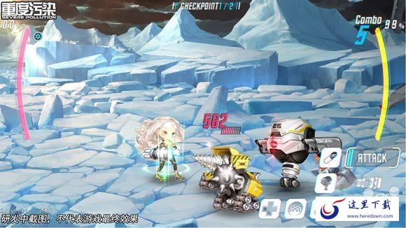 3、游戏关卡背景贴图比较细腻,机甲敌人和 BOSS 的设计也很带感,造型多样而且线条干净。经典的横版过关界面,动作/道具按键大量集中在画面右侧,光从美术风格来看的话是一款值得期待的横版动作射击手游。