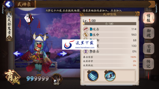 攻击:114 生命:960 防御:68 速度:100 暴击:0% 暴击伤害:150% 效果命中:0% 效果抵抗:0%