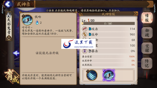 低吟:青天邪鬼一边低吟着曲子,一边放飞风筝,增加全体队友40点速度1回合。(为全队增加速度buff,作用并不是很大!在斗技中速度的要求比较高。)
