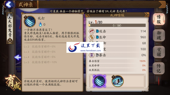 乱打:青天邪鬼跳至1名敌人面前,用手狠狠的抓伤目标,攻击目标3次,每次造成青天邪鬼攻击33%的伤害。