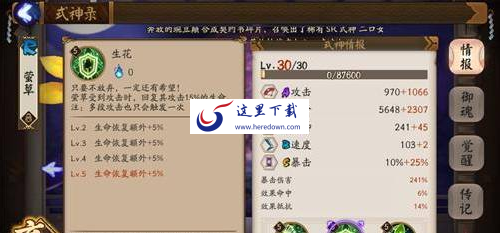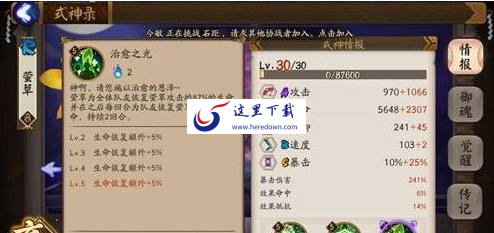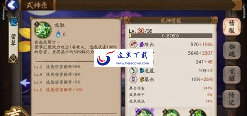 首先是萤草的普通攻击技能,攻击一名敌人造成攻击力100%的伤害,并将其中的30%转化为自身的生命值。这个技能可以说是相当的不错,普攻还能造成吸血效果,而且30%的吸血率也算是比较高的,这样一个技能如果给任意一个输出型式神,都是相当的强大。
