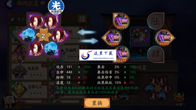 二、在上面的原始的御魂配置处搭配出自己想要的御魂方案后,点击下面御魂盒的1或2进行置换即可。