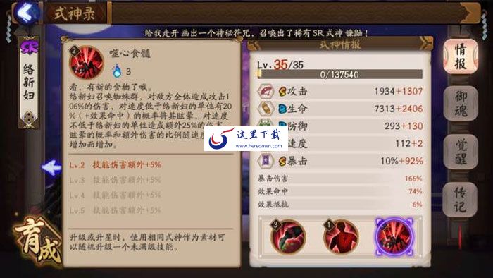 现技能是:速度比络新妇慢的敌方式神,络新妇有20%加命中率可以眩晕对方。