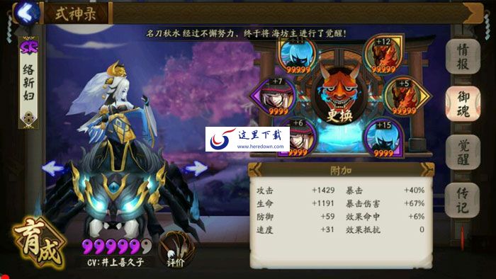*不喜欢第一个称呼?试试“高速控场妇”如何?现在络新妇还可以佩戴一身的高速御魂,来对对手的低速式神进行眩晕。但考虑到御魂搭配的难度(兼顾速度,伤害和效果命中),以及目前斗技整体速度的提升,个人还是更推荐第一种玩法。