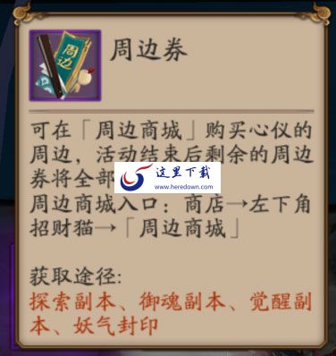 周边券获取方式:可通过探索、御魂、觉醒、妖气封印等玩法掉落该道具