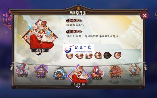 招财猫2件防御加成30%,4件在回合开始时,有概率获得2点鬼火。