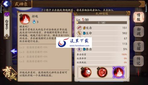 白童子召唤巨大的包子时,对全体敌方单位造成攻击100%伤害,并唤醒所有阵亡单位的魂魄,魂魄只能行动1次,继承目标100%的攻击,并在被唤醒时立即使用普攻对随机目标进行攻击。