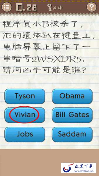 最囧游戏2第28关程序员小B被杀了,他的遗体趴在键盘上,电脑屏幕上留下了串暗号2WSXDR5,请问凶手可能是谁?