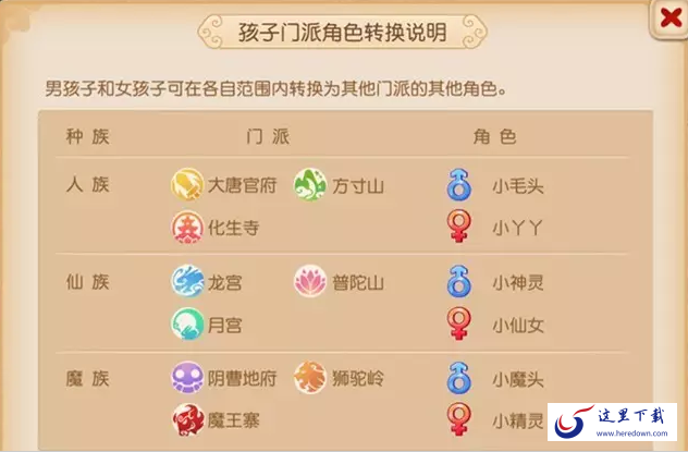 虽然可以跨种族互转孩子的门派,但是孩子的性别是不能转变的哟!成功转换门派后的孩子资质、成长、技能等级、特殊技能均会保留,门派技能替换为新门派技能。