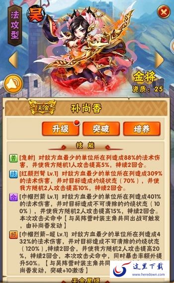 新版本中的金将孙尚香拥有持续灼烧伤害的超合击技能,配合专属必杀技引爆灼烧可以对敌方造成相当可观的伤害。推荐孙尚香与大乔、小乔、孙坚、周瑜加上吴国时装主角同时上阵,可以形成高续航高伤害的吴国特色阵容!