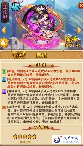 金将甄姬的定位是一名强力攻击将,当本身生命值越高时,对敌方造成的伤害越多,在释放专属必杀技能的同时可以回复我方武将2点怒气值,推荐在对方怒气值较高或我方怒气值较低时释放技能。