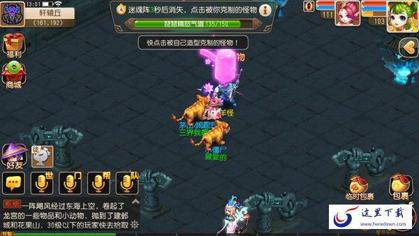 1、暂离队伍后,玩家会随机变成虎精,羊怪,花妖,在场地有四个怪物,分别在四个角上。玩家需要在场内点击被自身造型克制的怪物,要记住虎克羊、羊克花、花克虎。