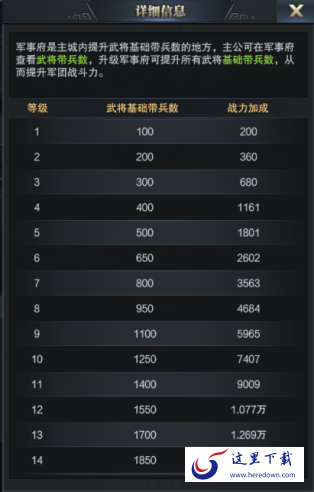 军事府是最直接的带兵数量加成,每提升一级,对部队中的每个队列都是单独进行加成计算。每级军事府150带兵量,在3队列的部队里,就是450数量的提升。