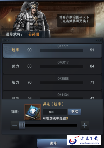 每个队列的主将统率属性和技能决定此队列的带兵数量。统率属性通过进修来提升,进修所需道具可以击杀土匪来获得。