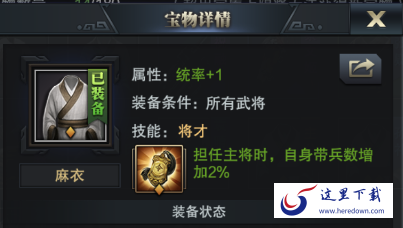 武将自带的(将才)技能可以提升带兵数,或者各类兵种加强的技能,可以通过升级来继续加强。也可以通过装备宝物来获得第二个技能,不过宝物带的技能无法继续升级的。部队内所有武将和宝物的技能效果是可以叠加的。