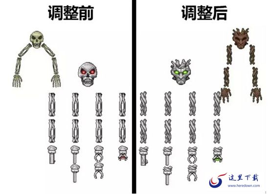 大名鼎鼎的骷髅长肉事件是某知名网游的玩家心中的伤,同样的事情在《泰拉瑞亚》也继续重演。不过,这一次的骷髅王并没有长肉,而是以新的形象再次登场。骷髅王与机械骷髅王两位受众经过“美容”之后,骨头变成相互纠缠的藤蔓,头颅也不再是骷髅形象,现在的样子变更为树人形象。