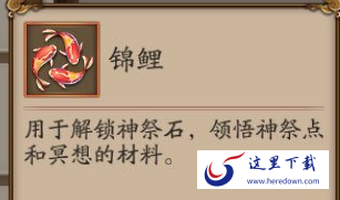 通过材料“锦鲤”可以激活神祭技能(每次消耗*1),激活后可以使用“锦鲤”进行冥想,每次冥想会有不一样的效果可自己选择一个保留(每次消耗*1)。