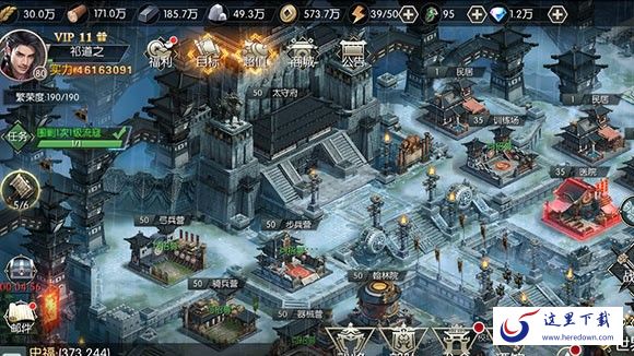 前期的新手任务相对简单,主君可自行操作通过,紧接着就要开始稳固城池,这就需要在城内建造一定的建筑,像外围的野地建筑铁矿场、石料场、伐木场、农田以及内部的兵营、仓库、校场、民居、翰林院。游戏中,城池的核心建筑是太守府,它是一切建筑升级的前提。