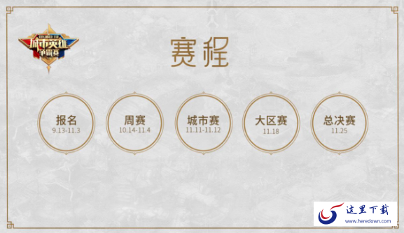 本届城市英雄争霸赛同样分为青春校园组和活力城市组两大组别,学生群体可凭借有效学生身份证明文件,参与到青春校园组的竞争中来;而活力城市组则允许任意玩家前往报名,没有任何身份限制。根据赛程安排,本届城市英雄争霸赛的报名时间为9月13日-11月3日,每一位想要角逐冠军荣耀的玩家,都可以在规定时间内,唤上三五好友一起组队报名;10月14日-11月4日为周赛阶段,众多战队将集结在各自城市,角逐进入11月11日-12日展开的城市赛的资格;而后,11月18日为大区赛,每一大赛区4个城市的晋级战队将齐聚一堂,竞争本大区进军11月25日全国总决赛的名额。历时两个多月的赛程,相信定会让每一位玩家欣赏到无数场精彩纷呈的顶级较量。