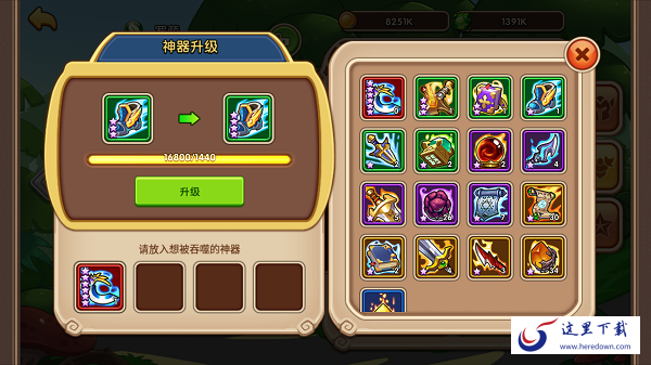 神器升级:可以消耗低品级神器为高品阶神器升级。