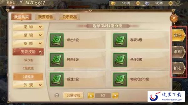 1、拍卖行机制调整:将“商城”中的“商会”移除,新增入口“交易”;“交易”中包含三个页签“商会”“求购”“拍卖”。