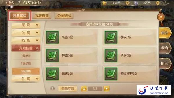 2、在商会中进行普通道具寄售后,会直接在 “我要购买”页签中开放交易,买方花费银子购买,出售后卖方获得扣除交易税后的等量银子
