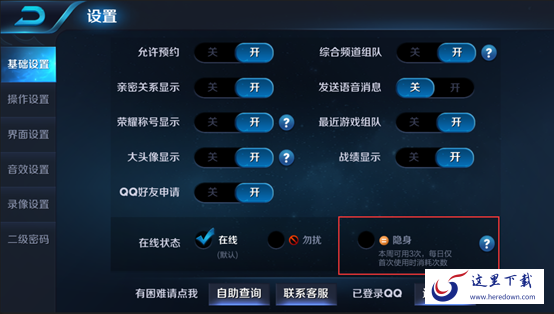 召唤师们可以在“设置=》基础设置=》在线状态”中进行隐身状态的设置。