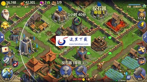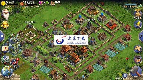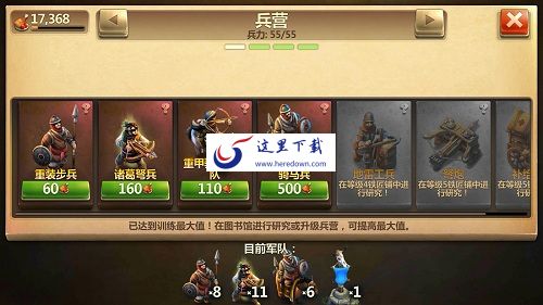 军事发展的前提是军事建筑的合理搭建。而军事建筑又分为攻击性和防御性建筑。攻击性建筑有生产部队的兵营,解锁兵种的铁匠铺以及竞技场和帝王陵等,而防御性建筑则有营寨、马厩、箭塔、投石器、指挥所等,强悍的军事力量必然有着攻守兼备的军事建筑。