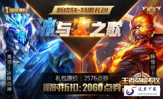 内含关羽限定皮肤-冰锋战神以及孙悟空传说皮肤-地狱火,都是傲娇的皮肤,只卖呆萌的价格,喜欢的召唤师千万不要错过哦!