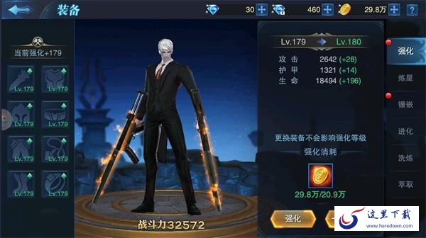 装备的提升主要分为装备的进化、强化、宝石镶嵌、炼星、萃取。高品质的装备可以通过挑战BOSS、装备进阶等方式获得。装备强化和炼星所需的材料也可以通过日常副本的方式获取。