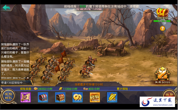 主公达到就开启奇道探险之旅,这是挂机式获取资源,可以获取元宝,金币,粮草、烈酒、兵法,兵书,经验。