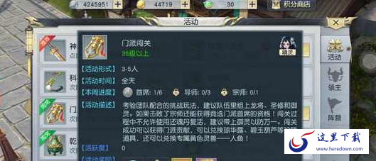 每天任何时候都可以挑战门派闯关,35级以上需要3-5人才可以进行挑战。