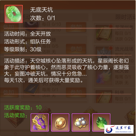 当等级达到30级以后,相信各位也在游戏内结识了不少小伙伴了,这时候就可以约好时间,参加全天开放的“无底天坑”(不要被名字吓倒,风景坑里独好),不仅可以获得大量经验,还有其他各种给力道具。