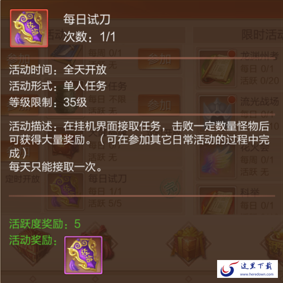 这里有个小细节需要注意以下,挂机界面的右下角,有一个小试牛刀的选项,请在挂机之前务必接取此任务。每天击杀一定数量的怪物,即可获得大量的奖励。