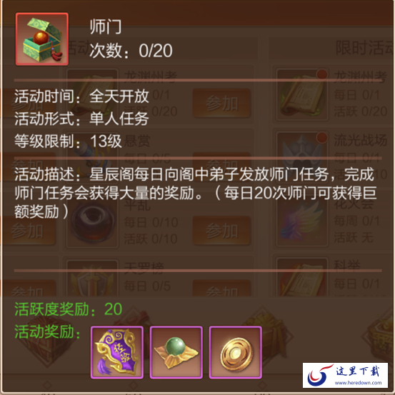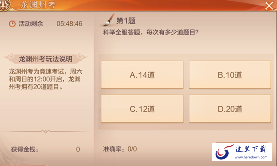 忙碌的做完师门任务之后,可以选择参加龙渊初考,周一至周五的每天中午12点至24点,都可在在活动界面进入龙渊初考参加答题活动,每次答题都会提供大量的经验。