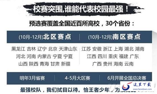 本届王者高校争霸赛的预选赛将在2017年10月至12月分南北两个赛区进行,两个赛区的每个城市赛点都将由官方挑选校队赛点以及公开赛点。多个赛点同时开赛,均采用BO1决出4强,4强决定后再采用BO3赛制决出冠军。其中,校队赛点的冠军即为本校校队,校队将与当地公开赛点的冠军组成省队(特殊省份除外),晋级四大区赛。强强联手,只为更高的荣耀!同时,这样的规则设定也意味着每个省份的晋级队伍不再局限于一支,这对数量众多的参赛队伍来说无疑是振奋人心的好消息。